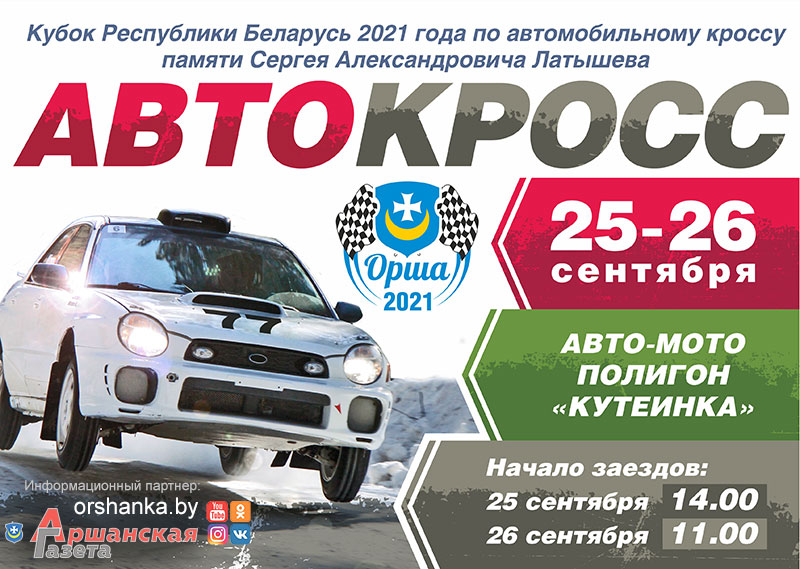 25-26 сентября в Орше на авто- мотополигоне «Кутеинка» состоятся соревнования на Кубок Республики Беларусь 2021 года по автомобильному кроссу памяти Сергея Александровича Латышева.
