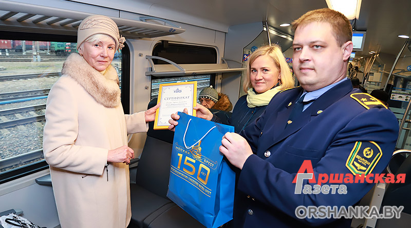 Сегодня на привычном маршруте ее ждал сюрприз. Прямо в поезде юбилейному пассажиру вручили сертификат за подписью начальника пассажирской службы БелЖД и памятные подарки.