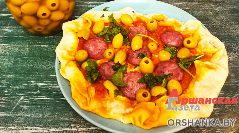 Отправляем лепешку в духовку на 15-20 минут (в зависимости от духовки). Вынимаем из духовки, выкладываем сверху кусочки колбасы и ставим обратно примерно на 7 минут. Готовые лепешки выкладываем на блюдо и посыпаем любимой зеленью.