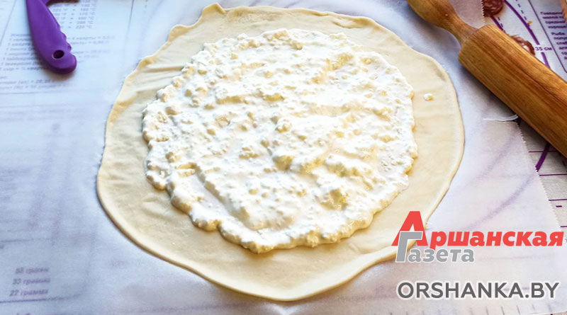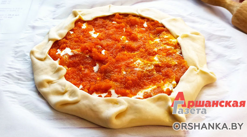 Тесто делим на части и раскатываем каждую толщиной не более 3 мм. Выкладываем сметанную заливку, затем на нее тыквенную начинку и защепляем края. Духовка должна быть горячей – 210-220 градусов.