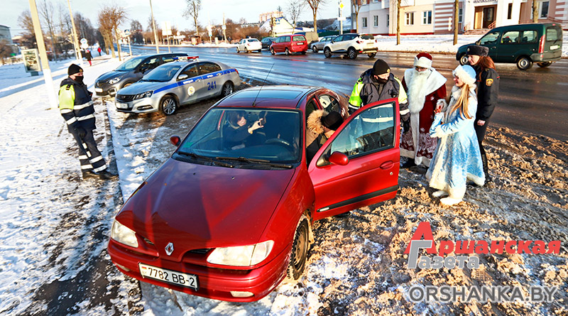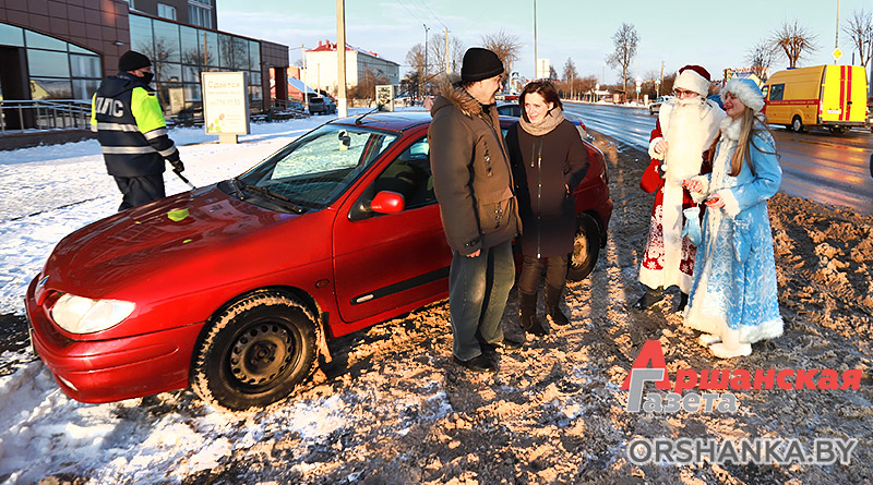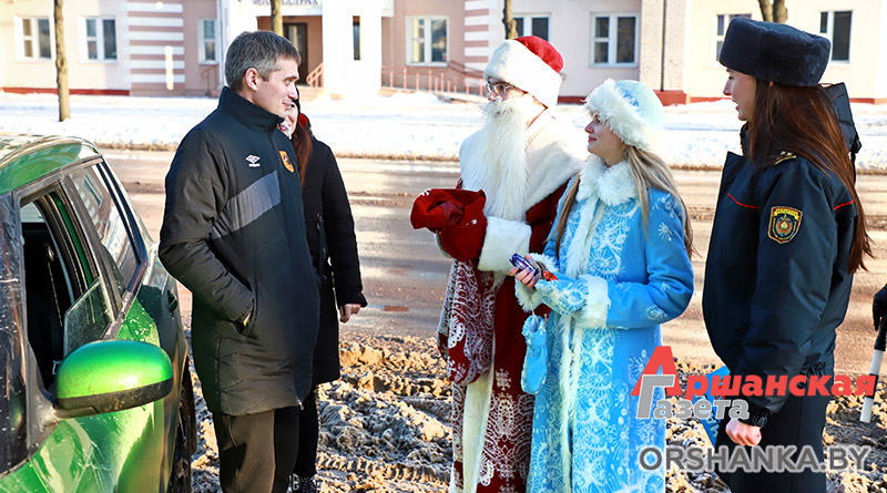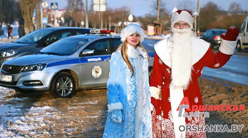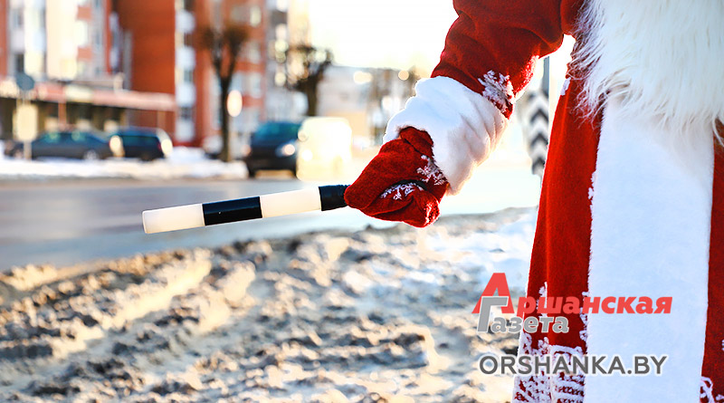 Сегодня на улицах Орши можно наблюдать необычный новогодний патруль. Вместе с сотрудниками ГАИ на патрулирование улиц города вышел настоящий Дед Мороз. В преддверии Нового года он сменил свой посох на полосатый жезл, чтобы напомнить горожанам об ответственном поведении на дороге.