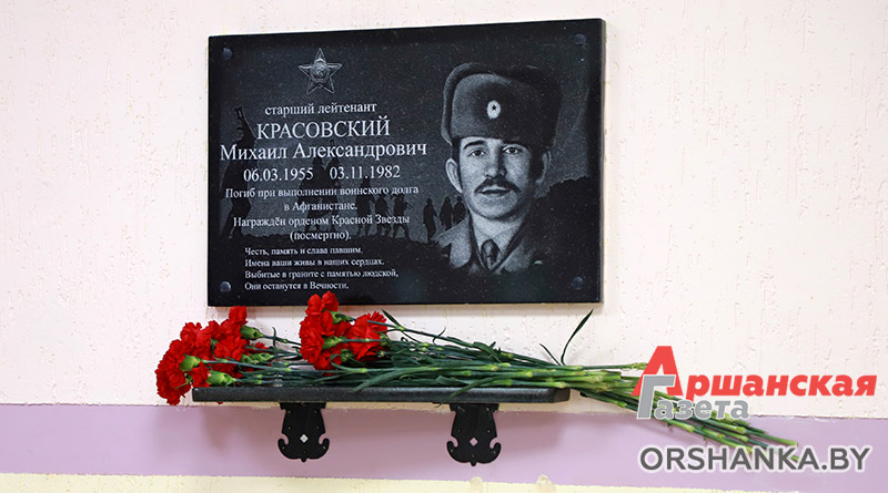 Из биографии. Красовский Михаил Александрович родился 6 марта 1955 года в д. Лучинщина Оршанского района. В 1972 г. окончил Браздетчинскую СШ и поступил Ташкентское высшее военное танковое командное училище, после окончания которого служил в Одесском военном округе. 4 ноября 1981 года был переведен в Туркистанский военный округ, а 18 ноября направлен в Афганистан. Гвардии старший лейтенант Михаил Красовский служил в Шинданде в 371-ом мотострелковом полку в должности командира танкового взвода. В одном из боев был ранен и проходил лечение в Кабульском центральном советском военном госпитале. Всего за несколько месяцев до смерти Михаил успел побывать дома. После ранения был переведен в Пули-Хумри начальником отдела хранения бронетанковой техники 3553-го склада бронетанкового имущества армии.