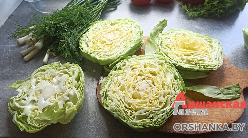 Кочан капусты нарезаем на пластинки толщиной 1,5 см, выкладываем на пергаментную бумагу, слегка смазанную растительным маслом.