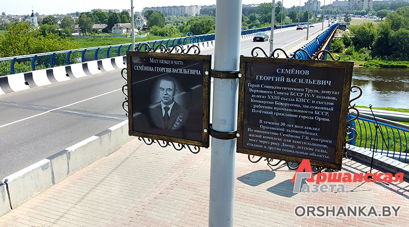 Торжественное мероприятие по увековечению памяти Героя Социалистического Труда, заслуженного работника легкой промышленности БССР, Почетного гражданина г. Орши состоялось у моста через реку Днепр в районе льнокомбината. На гранитной плите написано: «Мост назван в честь Семёнова Георгия Васильевича». Это дань памяти человеку, своей жизнью заслужившему уважение потомков.