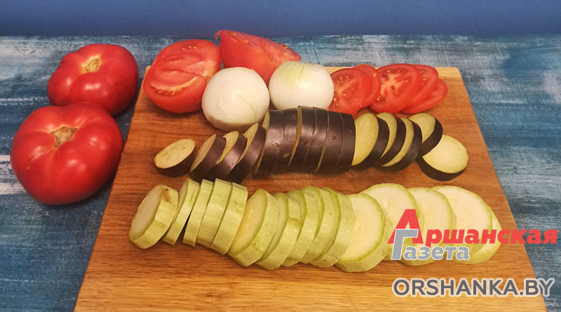 Для приготовления нам потребуется: 2 небольших баклажана, 2 кабачка, 500 г помидоров, 2 луковицы, 2 болгарских перца, 4 зубчика чеснока, 100 г твердого сыра (пармезан), соль, прованские травы, оливковое масло.