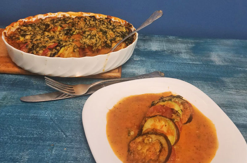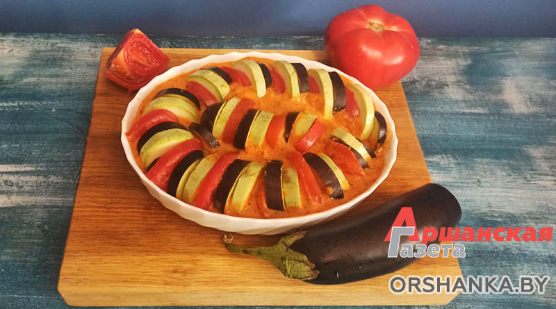Готовим соус. Нарезаем мелко лук и обжариваем на оливковом масле до золотистой корочки. Оставшиеся помидоры и перец нарезаем и отправляем к луку, режем чеснок, соль, прованские травы добавляем по вкусу. Тушим до готовности. Взбиваем в блендере до однородной массы. Наливаем соус в форму для запекания. В соус выкладываем по кругу кусочки баклажанов, помидоров, кабачков и т. д., пока не заполнится форма. Сверху посыпаем тертым сыром. Отправляем в духовку минут на 40 (ориентируйтесь на свою духовку). По желанию украшаем готовое блюдо базиликом.