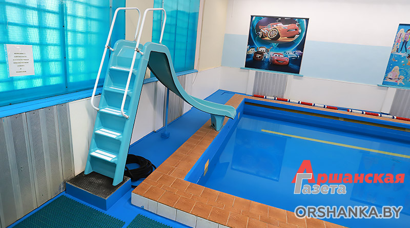 Малую ванну бассейна, где обучают детей плаванию, покрыли водостойким составом, осталась горка, а интерьер помещения обновили.