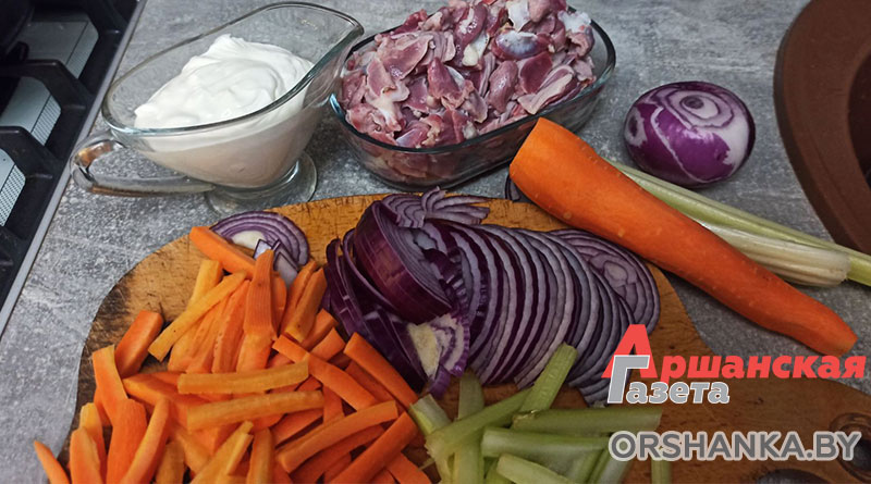 Для приготовления нам понадобится: 500 г куриных желудочков, 2-3 луковицы, 2 моркови, 4 стебля сельдерея, 200 г сметаны, 1 ч. л. кукурузного крахмала, 50 г воды, растительное масло, соль, перец.