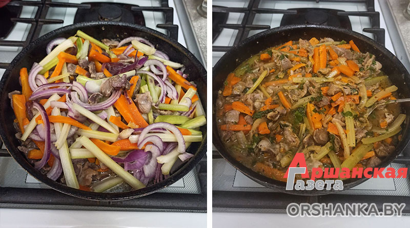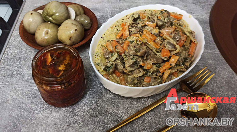 Куриные желудочки, тушеные в сметане и с овощами