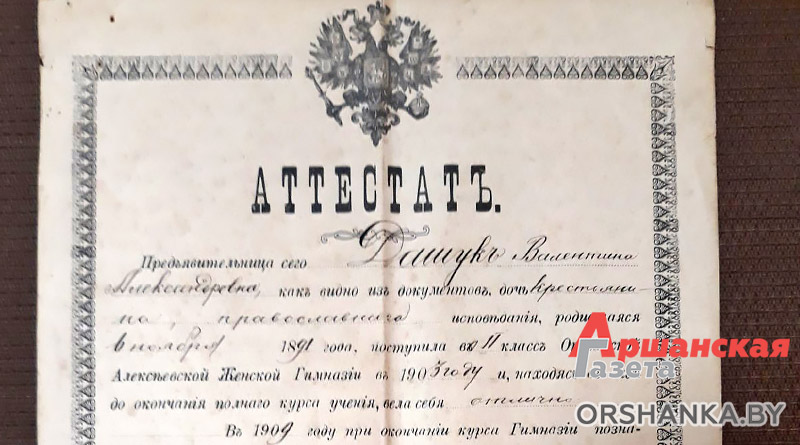 В экспозиции музея истории и культуры города Орши представлен уникальный экспонат: аттестат выпускницы Алексеевской женской гимназии Дашук Валентины Александровны. В аттестате указаны происхождение – «дочь крестьянина», а также вероисповедание – православное вероисповедание, дата рождения – «6 ноября 1891 года». Начала свое обучение Валентина в 1903 году, поступив во второй класс гимназии, в этом же году и начала действовать Оршанская Алексеевская женская гимназия. В аттестате сказано, что до окончания полного курса обучения «вела себя отлично». Судя по оценкам, Валентина была «хорошисткой». Оценки «хорошо» поставлены за следующие предметы: русский язык с церковно-славянской словесностью, математика, всеобщая и русская география, естественная история, всеобщая и русская история, рукоделие. Валентина преуспела в таких предметах, как закон Божий, физика и космография – по ним оценки «отлично». Были и «необязательные» предметы учебного курса: французский язык (удовлетворительно), рисование (отлично), гигиена (хорошо). В графах по немецкому языку и педагогике оценки не проставлены. На оборотной стороне располагаются сведения о том, что Валентина окончила общий курс «учения в женской гимназии» и ей предоставляются «права и преимущества в соответствие с действующим законодательством». Сообщается дата вручения аттестата – «3 июня 1909 года». Имеются подписи начальника гимназии, главной надзирательницы, членов совета и письмоводителя. Кроме того, имеется печать Оршанской женской гимназии Министерства Народного Просвещения с гербом Российской империи. Аттестат напечатан в типографии Иоселевича.