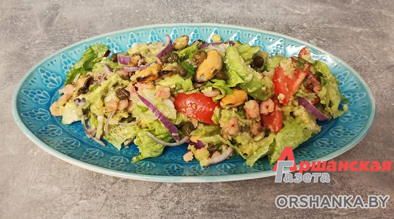 Нам понадобится: салат айсберг, 100 г креветок, 100 г мидий, пара помидоров, 1 средний авокадо, 1 красная луковица, 50 г сливочного масла.