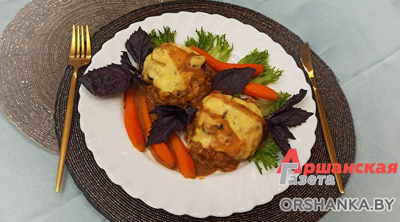 Выкладываем начинку в центр гнезда. Запекаем при температуре 200 градусов минут 30. Затем достаем, посыпаем оставшимся сыром и запекаем еще минут 10. Готовое блюдо выкладываем на порционную тарелку, по желанию украшаем зеленью.