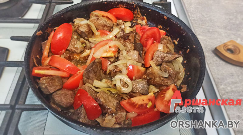 Нам понадобится: 400 г куриной печени, 1 луковица, 4 шт. помидоров, 2 ст. л. соевого соуса, 1 ст. л. меда, соль и приправа по вкусу, мука для панировки, растительное масло, свежая зелень.