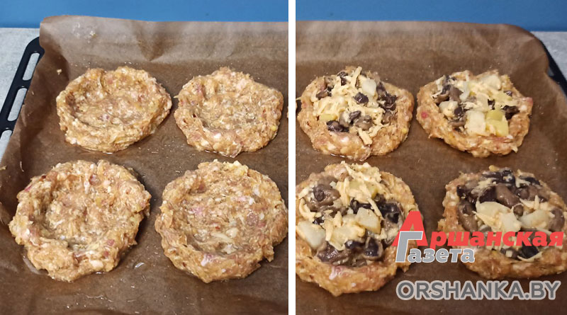 Приготовление. Соединяем фарш, яйца, луковицу, соль и перец. Перемешиваем. Застилаем противень пергаментной бумагой. Формируем из фарша эффект гнезда и выкладываем на противень. Готовим начинку. Отваренные грибы смешиваем с крупно нарезанным отварным картофелем. Добавляем кунжутный соус и 100 г тертого сыра, перемешиваем.