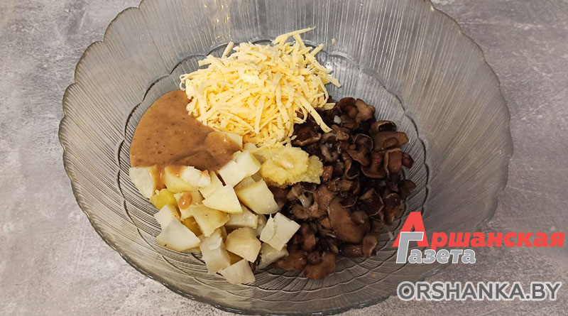 Для начинки: 300 г отваренных грибов, 2 отварных картофеля, 200 г сыра, 4 ст. л. кунжутного соуса.