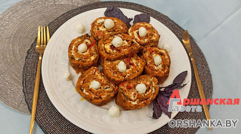 Для приготовления рулета нам понадобится: морковь – 400 г, 3 яйца, красный перец, 30 г вяленых помидоров, зелень – базилик либо петрушка, кинза, укроп (на ваш вкус), творожный сыр – 200 г, чеснок, перец, соль, растительное масло.
