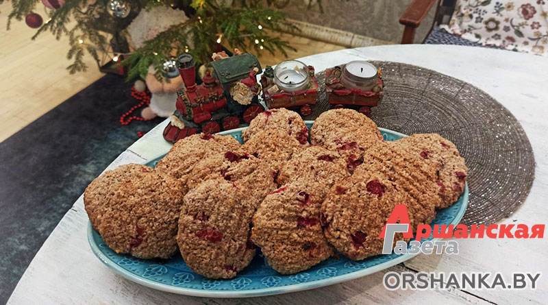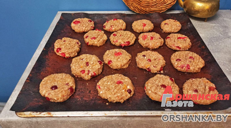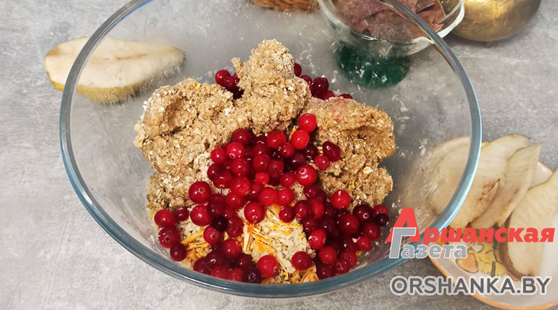 Нам понадобится: 210 г муки, 160 г сахара, 2 яйца, 150 г сливочного масла, 5 г разрыхлителя, 150 г хлопьев геркулеса, 100 г свежей или вяленой клюквы, 50 г тыквенных цукат (можно заменить на любые), 100 г орехов (на ваш вкус), ванилин, имбирь и корица по вкусу.