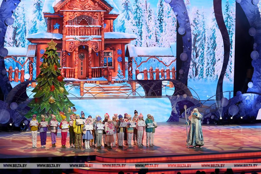 «От всего сердца еще раз поздравляю всех вас, маленьких и уже взрослых — будущее нашей Беларуси, ваших педагогов, воспитателей, учителей, ваших родителей с Новым годом! Я желаю вам отличного настроения, крепкого здоровья и, самое главное, успехов в учебе. Учеба для вас — главнейшая задача на этом этапе вашей жизни. А сейчас с большим удовольствием уступаю эту сцену нашим хозяевам — Деду Морозу и Снегурочке», — сказал белорусский лидер.