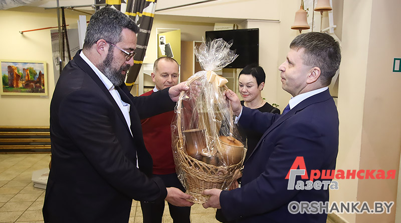На память о визите заместитель председателя Оршанского райисполкома Виктор Колочёв вручил господину Миркину сувенирные изделия Центра народного творчества и ремесел г. п. Копысь.