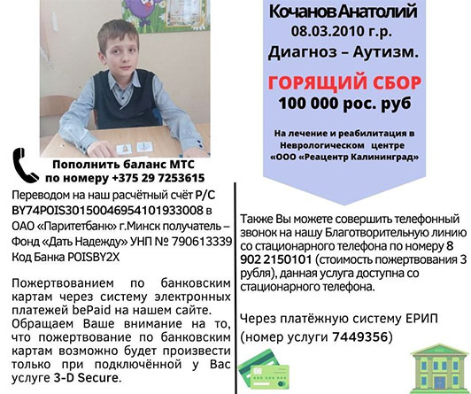 Оказать нам помощь возможно коллективным сбором денежных средств и переводом на наш расчётный счёт Р/С BY74POIS30150046954101933008 в ОАО «Паритетбанк» г. Минск получатель – Фонд «Дать Надежду» УНП № 790613339 Код Банка POISBY2X, либо в индивидуальном порядке или коллективом через: