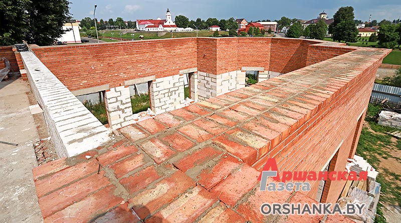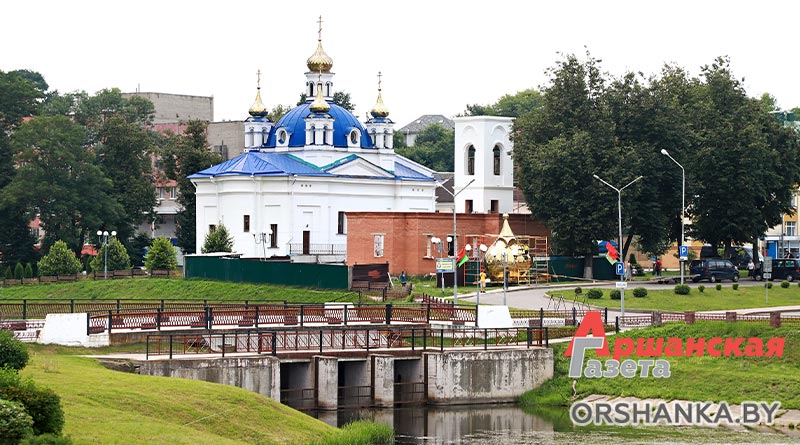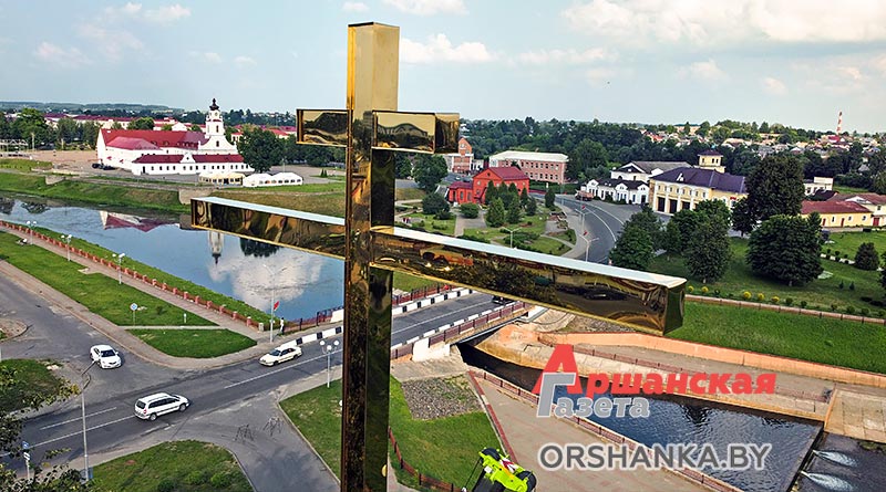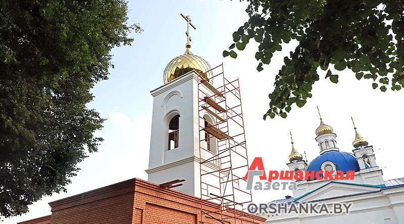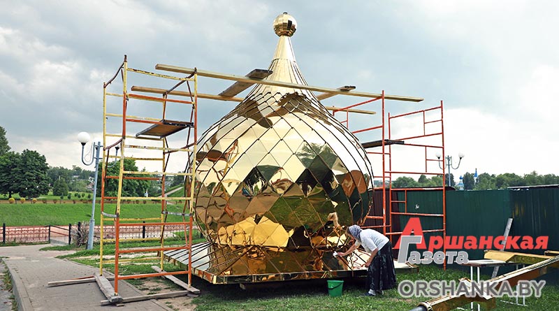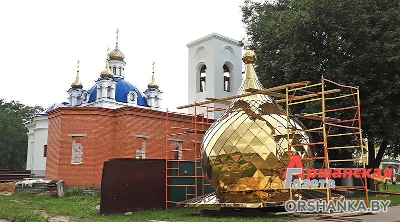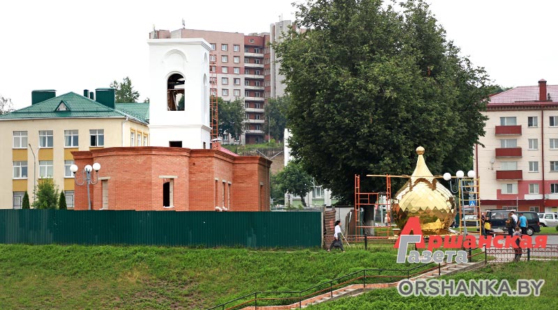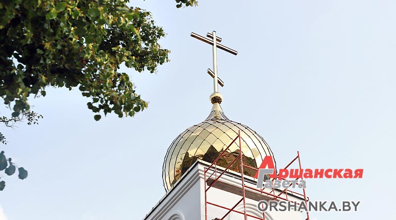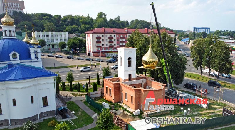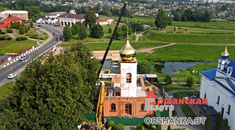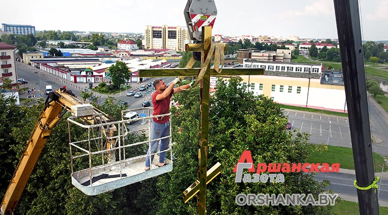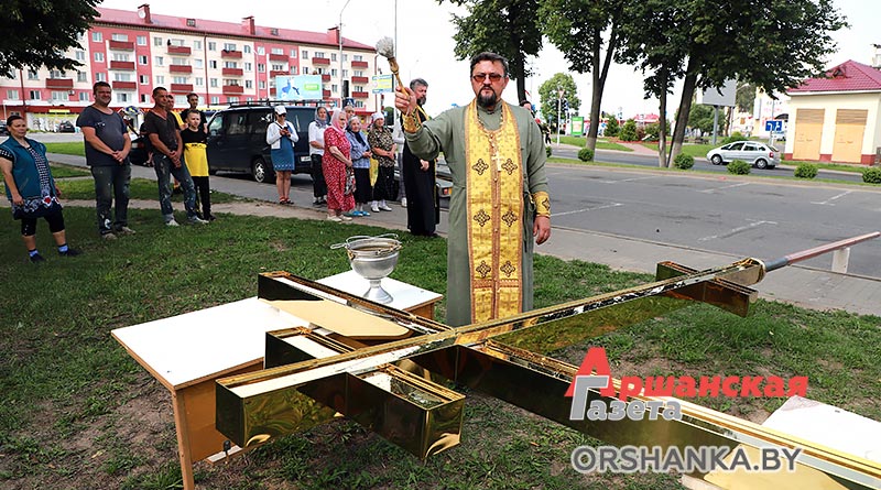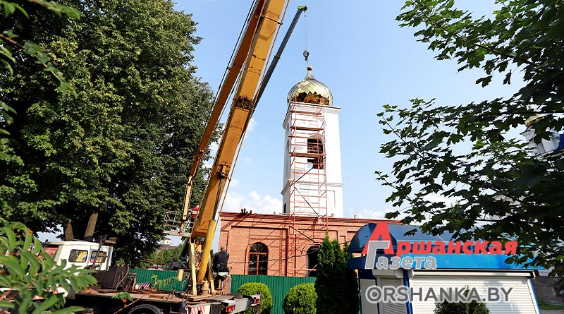 Старший благочинный церквей Оршанского округа протоиерей Валерий Серко и благочинный церквей центрального благочиния г. Орши иерей Дмитрий Савушкин совершили молитву перед началом работ. Купол и крест перед установкой были освящены.