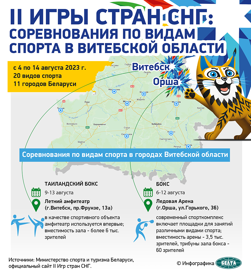 Соревнования по боксу II Игр стран СНГ стартуют в Ледовой арене Орши 6 августа и продлятся до 12-го. Старт дневных сессий запланирован на 12.00, вечерних — на 16.00. За победу будут бороться представители 10 стран: Азербайджана, Армении, Беларуси, Кыргызстана, России, Таджикистана, Туркменистана, Узбекистана, Ирана и Пакистана.