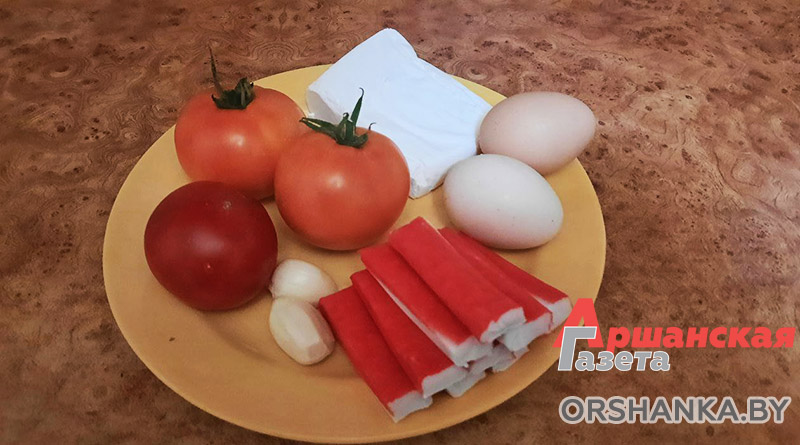 Ингредиенты: творог – 1 пачка (200 г), чеснок – 1-2 зубчика, яйцо куриное – 2 шт., томат – 2 шт., крабовые палочки – 1 упаковка (100 г), зелень, майонез.