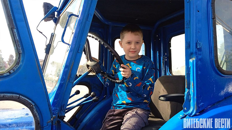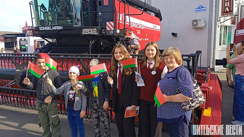 Дзятва і дарослыя тоўпяцца ля пляцоўкі, дзе дэманструецца сучасная і рэтра- сельскагаспадарчая тэхніка.