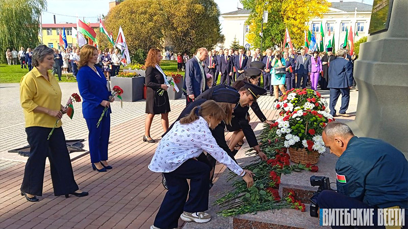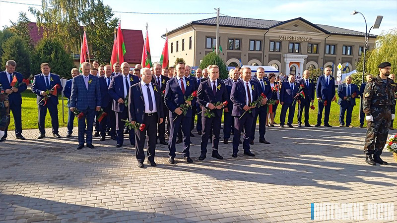 На цэнтральнай плошчы Шаркаўшчыны ўдзельнікі свята ўсклалі кветкі да брацкай магілы ваеннаслужачых, якія, не шкадуючы свойго жыцця, абаранялі шаркаўшчынскі край ад нямецка-фашысцкіх захопнікаў. У мерапрыемстве прымаюць удзел старшыня абласнога выканаўчага камітэта Аляксандр Субоцін, старшыня абласнога Савета дэпутатаў Уладзімір Цярэнцьеў, начальнік галоўнага ўпраўлення кадравай палітыкі Адміністрацыі Прэзідэнта Рэспублкі Беларусь Гуйда Аляксей, дэпутаты Палаты прадстаўнікоў Нацыянальнага сходу Рэспублікі Беларусь, намеснікі старшыні аблвыканкама, кіраўнікі структурных падраздзяленняў аблвыканкама, старшыні райвыканкамаў, ветэраны працы, прадстаўнікі працоўных калектываў, устаноў і грамадскіх арганізацый.