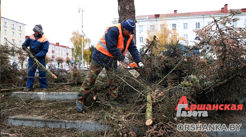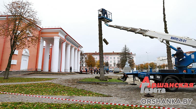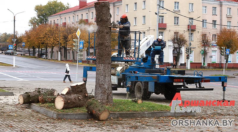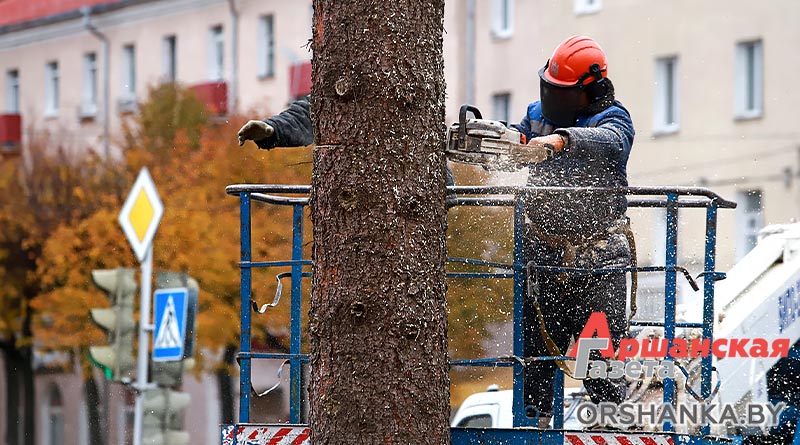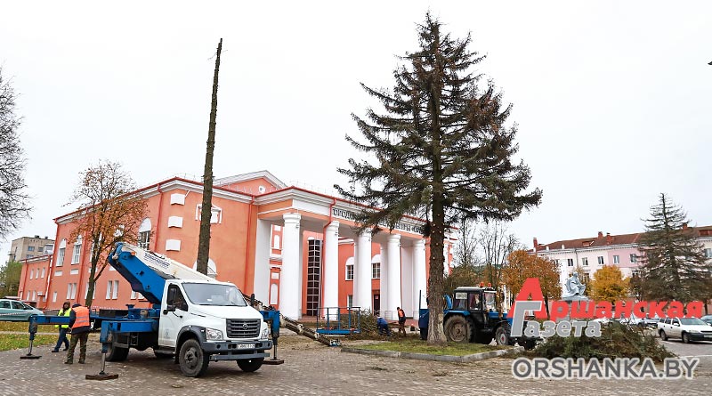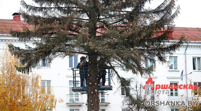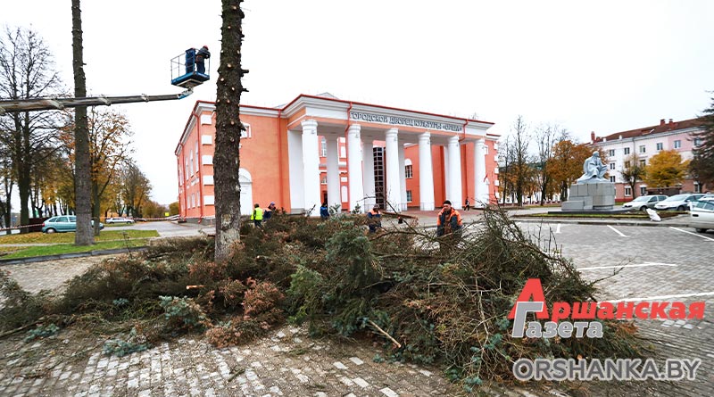 Сегодня работники Оршанской спецавтобазы проводили работы по удалению трех елей на площади возле ГДК «Орша».