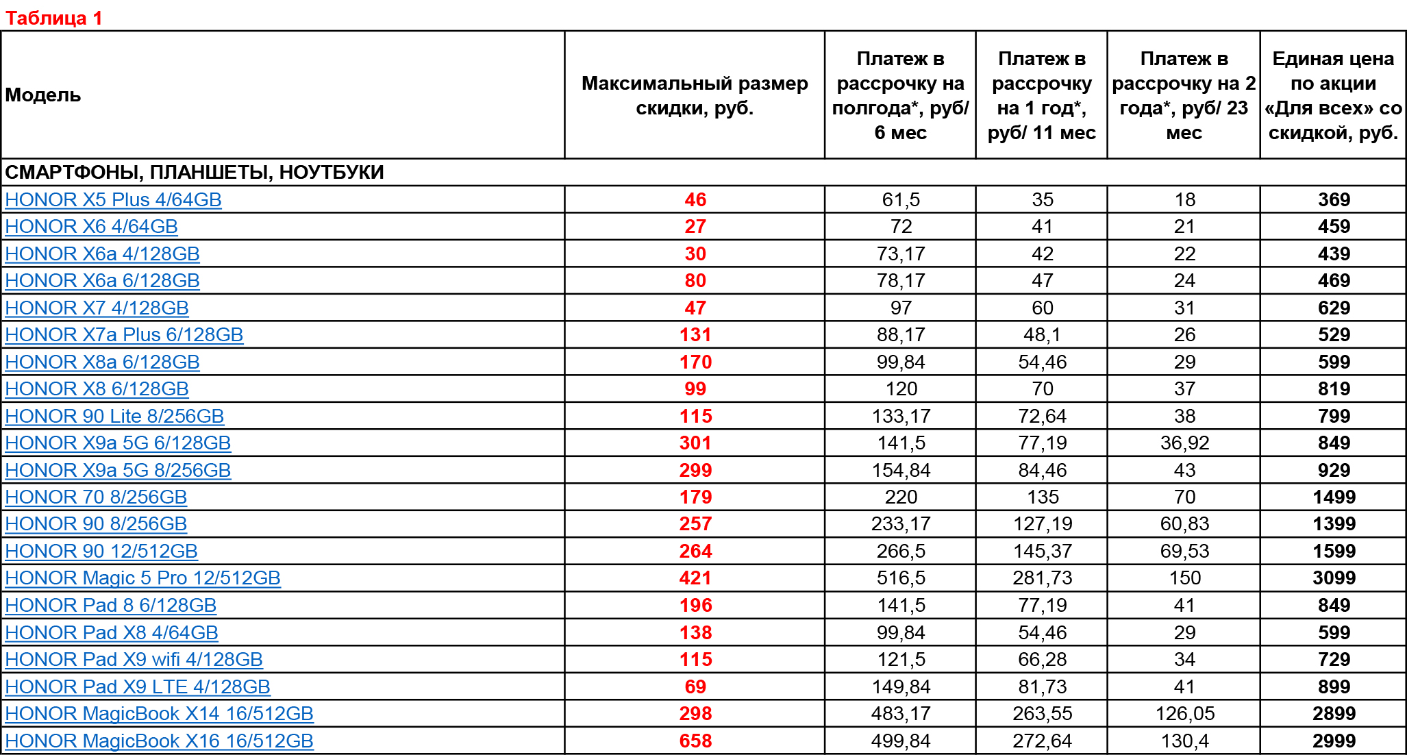 Перечень устройств HONOR с акционными ценами и максимальными размерами скидки представлен в таблице: