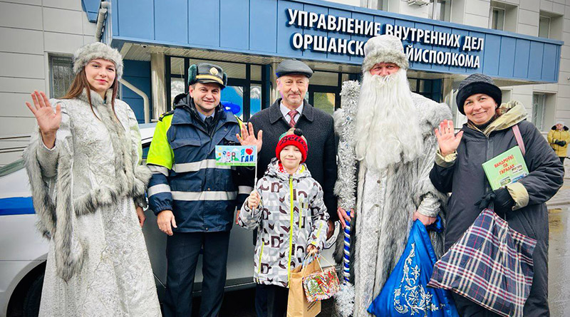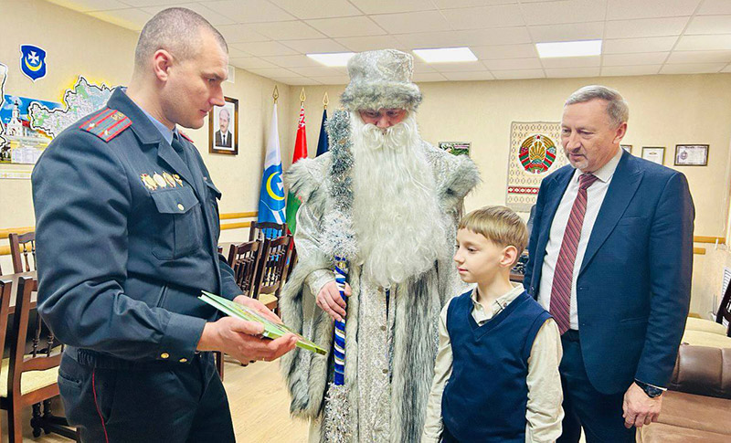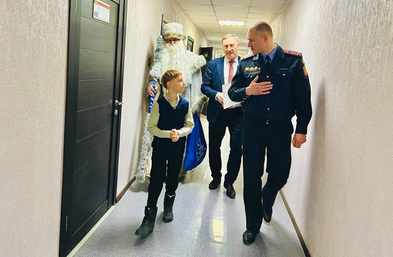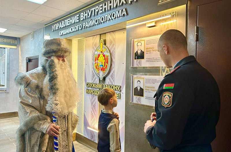 Сегодня Даниил Куратник – почетный гость на ул. Энгельса, 25. Его в Оршанском РУВД встретил Дед Мороз, организовал экскурсию по кабинетам, познакомил с работой блюстителей правопорядка, их техническим оснащением. Не обошлось без подарков. Кроме сладостей, Данику вручили книгу о путешествиях по Беларуси. Но и это было не все. На выходе из Оршанского РУВД мальчика ждала Снегурочка. Сотрудник Госавтоинспекции напомнил ребенку о необходимости соблюдать правила дорожного движения и подарил тематические сувениры.