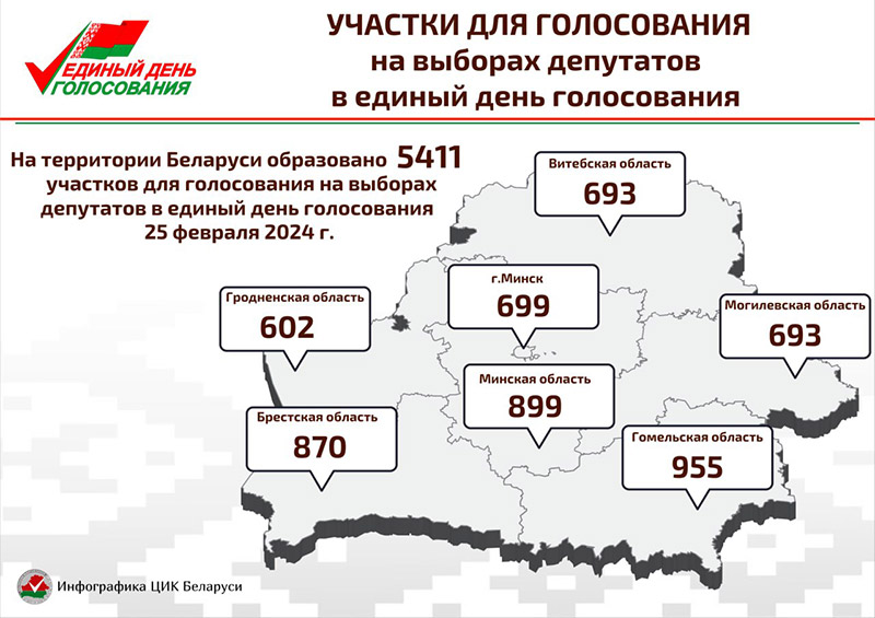 Наибольшее число участков для голосования сформировано в Гомельской и Минской областях (955 и 899 соответственно), 870 в Брестской области, 693 в Витебской, 693 в Могилевской, 602 в Гродненской и 699 в г. Минске.