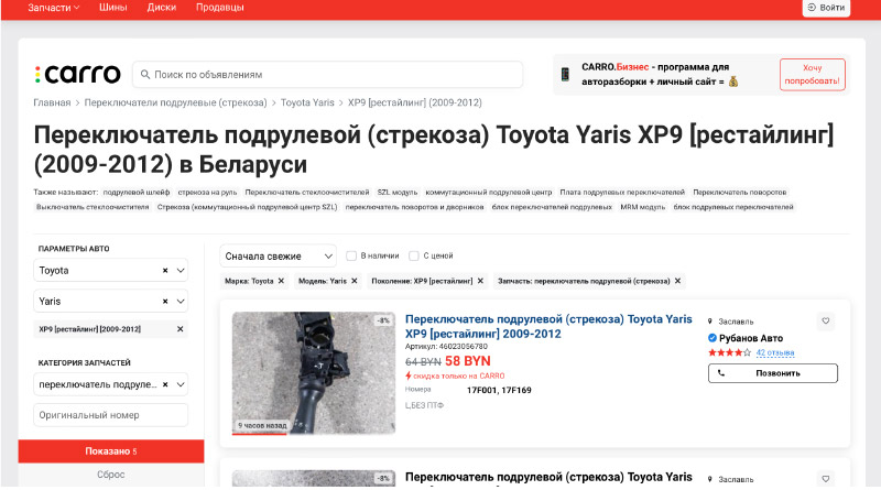 На Carro.by представлены различные категории запчастей, что делает поиск удобным и быстрым. Система фильтрации позволяет пользователям легко находить нужные им товары по ключевым характеристикам, таким как марка автомобиля, тип запчасти и ценовой диапазон.