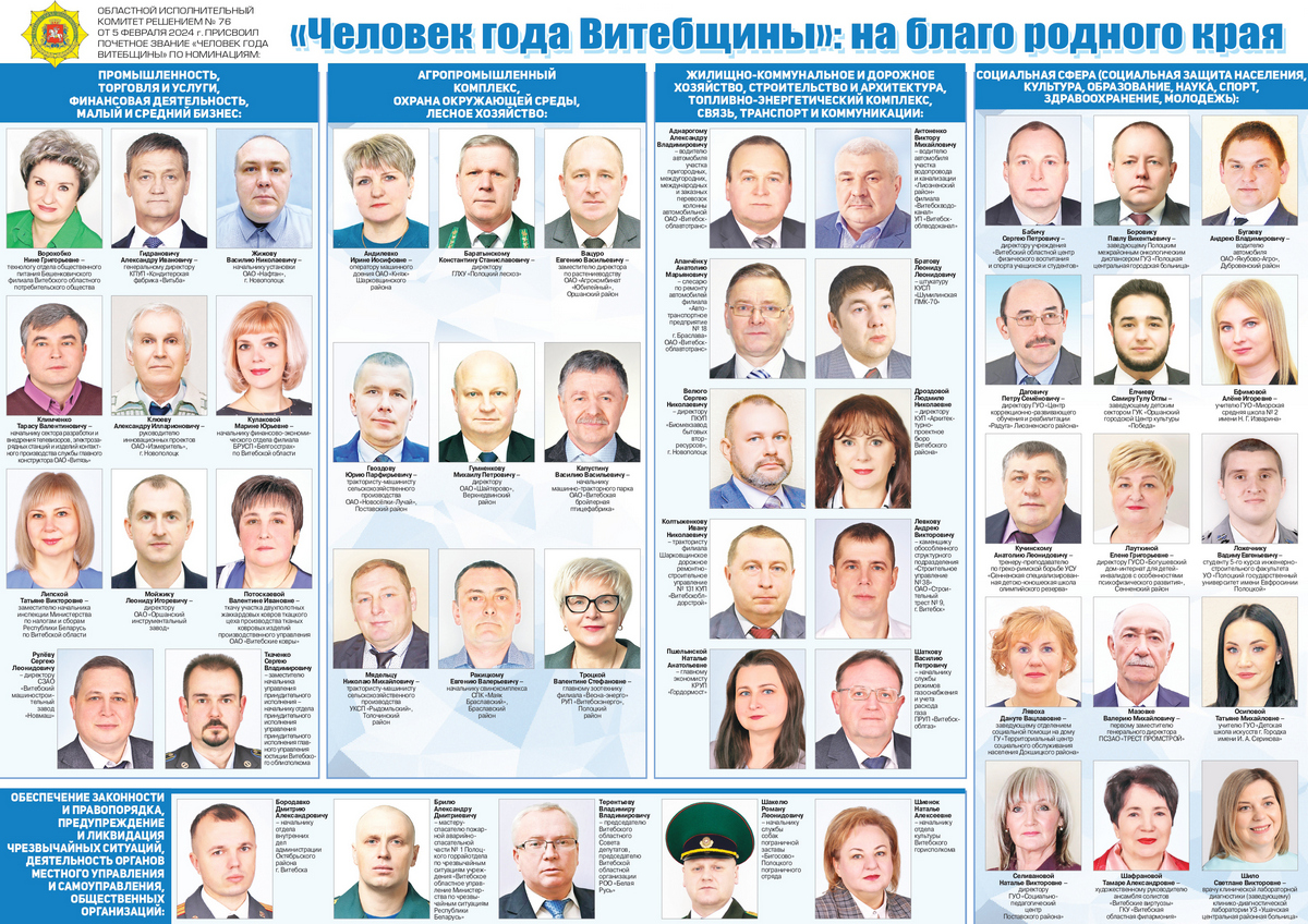 Главное Стали известны имена лауреатов почетного звания «Человек года Витебщины — 2023» 08.02.2024 2615 orshanka Решением облисполкома № 76 от 5 февраля 2024 года присвоено почетное звание «Человек года Витебщины» по номинациям: