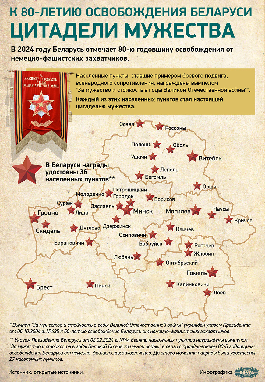 ** Указом Президента Беларуси от 02.02.2024 г. №44 девять населенных пунктов награждены вымпелом «За мужество и стойкость в годы Великой Отечественной войны» в связи с празднованием 80-й годовщины освобождения Беларуси от немецко-фашистских захватчиков. До этого момента награды были удостоены 27 населенных пунктов.