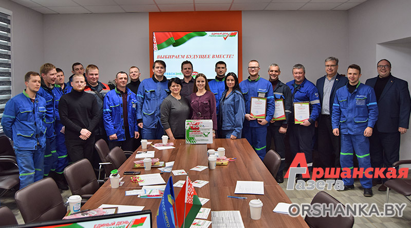 Участники встречи воспользовались возможностью напомнить гражданам страны об их конституционном избирательном праве и выборах депутатов Палаты представителей Национального собрания восьмого созыва и местных Советов, отправив карточку-флаер «Выбираем будущее вместе!» потенциальным избирателям-коллегам, друзьям, близким людям, не забыв при этом и ветеранов труда филиала. Это стало возможным благодаря молодежной инициативе БРСМ «Паштоўка. БЕЛ».