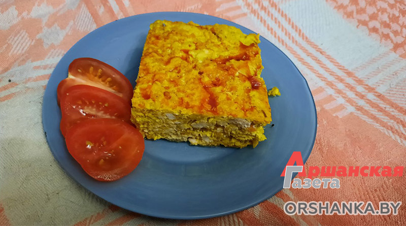 В подготовленную массу добавляем нарезанные кусочки филе и опять перемешиваем. Форму для выпечки смазываем сливочным маслом. Выкладываем запеканку и разравниваем лопаткой. Ставим в разогретую до 180 градусов духовку. Запекаем приблизительно около 40 минут. Затем достаем и смазываем запеканку томатным соусом или томатной пастой. И еще ставим на 10 минут. Достаем запеканку и даем остыть 10 минут.