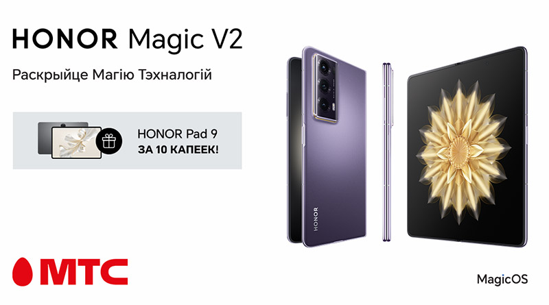 В МТС поступил в продажу смартфон HONOR Magic V2. Модель впечатляет инновационным дизайном со складным корпусом. Новинку можно приобрести в рассрочку с ежемесячным платежом от 260,83 рубля. Также при покупке HONOR Magic V2 предлагается бонус за 10 копеек — HONOR Pad 9.