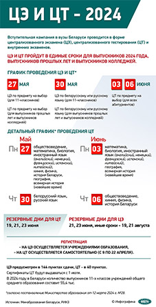 В 2024 году сроки проведения ЦЭ и ЦТ будут едиными. Так, 27 мая состоится ЦЭ для 11-классников по предмету по выбору и одновременно ЦТ для выпускников прошлых лет по одному из двух профильных предметов — вступительных экзаменов в вуз на выбор абитуриентов. ЦЭ для 11-классников и одновременно ЦТ для выпускников прошлых лет по белорусскому или русскому языку пройдет 30 мая (язык выбирает абитуриент). ЦТ по второму из двух профильных предметов — вступительных экзаменов в вуз на выбор абитуриентов — состоится 3 и 6 июня.