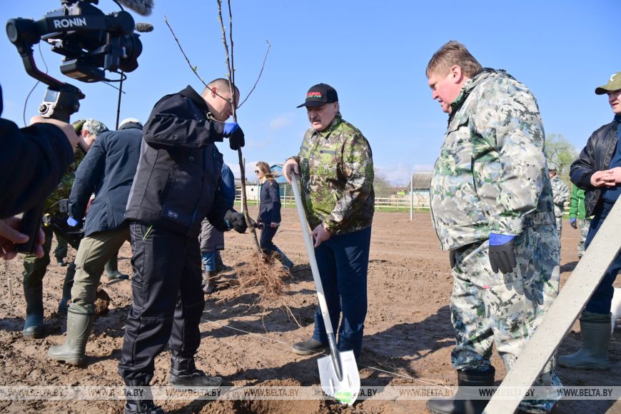 Белорусский лидер принимал участие в субботнике на своей малой родине, где занимался посадкой яблонь.