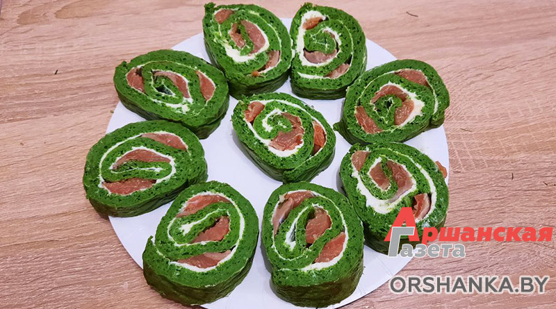 Красивый изумрудный цвет, который придает закусочному рулету шпинат, оттеняется белоснежностью сливочного сыра и яркими вкраплениями красной рыбы. На вкус все продукты прекрасно сочетаются между собой – нежный яично-шпинатный бисквит, сливочный сыр с легкой лимонной кислинкой и соленый насыщенный лосось.