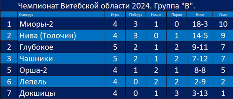 После четырех игр «Орша-2» занимает пятое место в группе из семи команд, «Миоры-2» удерживают первенство.