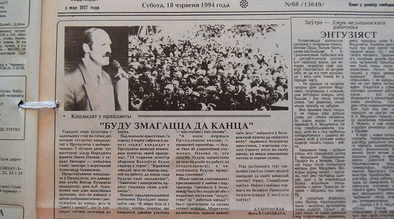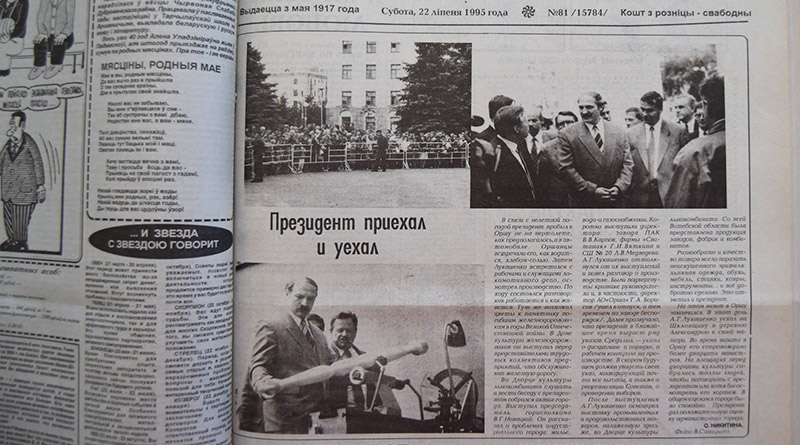 В архивах «Аршанскай газеты» сохранились уникальные материалы о первых визитах Александра Лукашенко в Оршанский район – малую родину Главы государства. Мы полистали газеты прошлых лет и нашли публикации о встрече будущего Президента Республики Беларусь с избирателями. Это знаменательное событие произошло 15 июня 1994 года в Оршанском городском парке культуры и отдыха. Жители города в ходе встречи выразили слова признательности, уважения и поддержки в адрес Александра Григорьевича. Этот исторический момент освещался на страницах «Аршанскай газеты» в № 68 от 18 июня 1994 года. А 10 июля 1994 года народ сделал свой выбор, и уверенную победу одержал Александр Лукашенко, набрав 80% голосов.