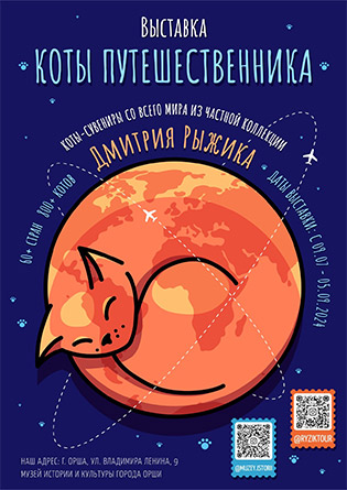 В Музее истории и культуры г. Орши (ул. Владимира Ленина, 9) по 6 сентября 2024 г. будет проходить выставка «Коты путешественника» витебского коллекционера Дмитрия Рыжика.