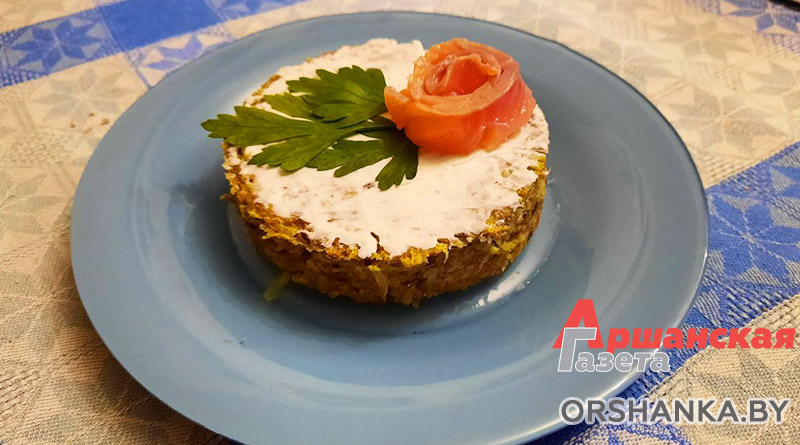 Ингредиенты: кабачки – 300 г, яйцо куриное – 2 шт., разрыхлитель – 1 ч. л., кукурузный крахмал – 3 ст. л., кунжут, льняное семя, соль – по вкусу, сыр творожный – 30 г, форель слабосоленая – 50 г.