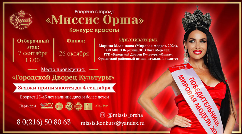 В Орше пройдет конкурс красоты «Миссис Орша-2024». Организаторами являются Оршанский районный исполнительный комитет, отдел культуры Оршанского районного исполнительного комитета. Непосредственное руководство организацией и проведением конкурса осуществляется общественным объединением «Молодежная культурно-просветительская организация «Вершина».