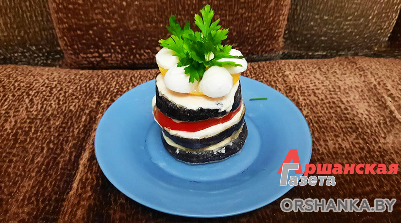 Ингредиенты: баклажаны – 3 шт., помидоры – 3 шт., чеснок – 3 зубчика, мука (крахмал кукурузный) – 3 ст. л., сыр моцарелла, зелень, майонез, соль, масло растительное – по вкусу.