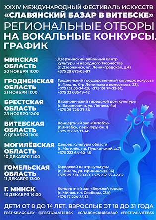 Региональные отборы к международным конкурсам в рамках XXXIV Международного фестиваля искусств «Славянский базар в Витебске» стартуют 20 ноября в Минской области (ГУ «Дзержинский районный Центр культуры и народного творчества»).