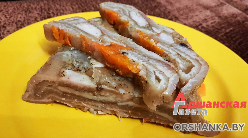 Ингредиенты: шкурки свиные – 0,7-1 кг, лук – 2 шт., морковь крупная – 1 шт., черный перец горошком – 5-6 шт., душистый перец горошком – 2-3 шт., гвоздика – 2 шт., лавровый лист – 4-6 шт., вода – 1,2 л, чеснок – 50 г, черный молотый перец – 0,5 ч. л., красный молотый перец – 0,5 ч. л., зелень сушеная – 1,5 ч. л., соль – 1 ст. ложка.